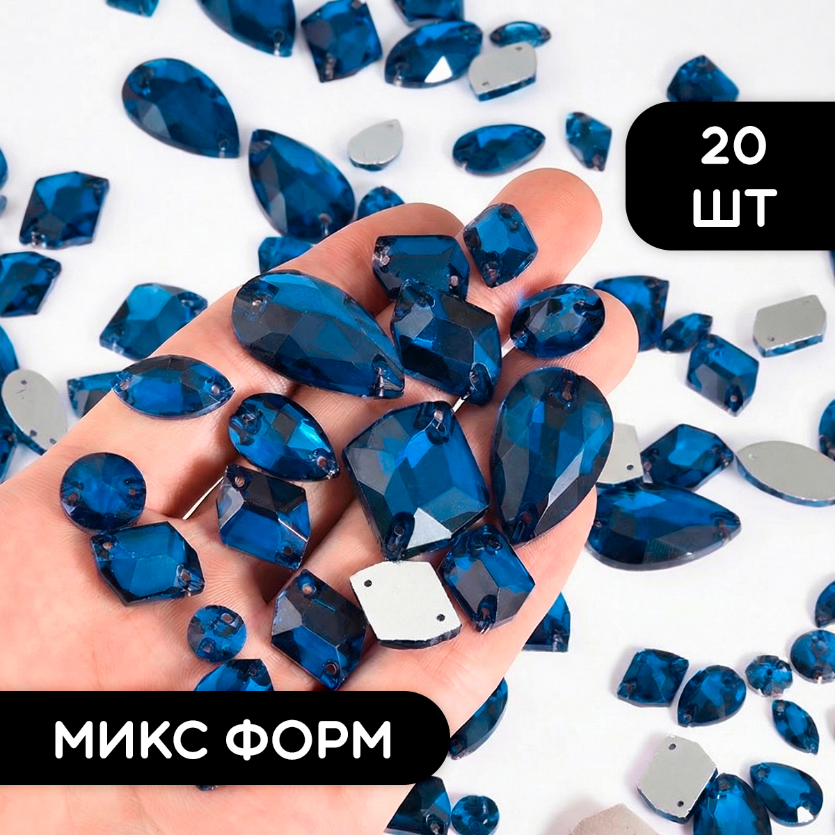 Набор пришивных стеклянных страз, микс форм, цвет Blue, 20 шт