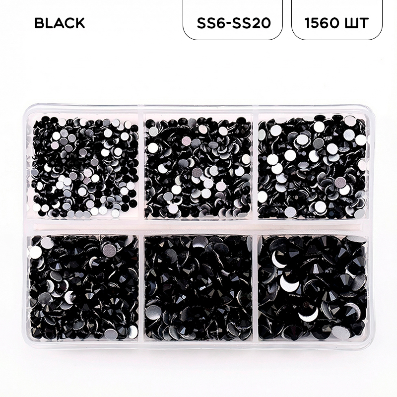 Набор страз BLACK (чёрные стразы холодной фиксации) — универсальный комплект для стильного и выразительного декора. В наборе 1560 кристаллов различных размеров (SS6–SS20), что позволяет создавать как мелкие детали, так и крупнозернистые акценты. Плотный, насыщенно-чёрный цвет придаёт дизайну глубину, драматичность и элегантность.