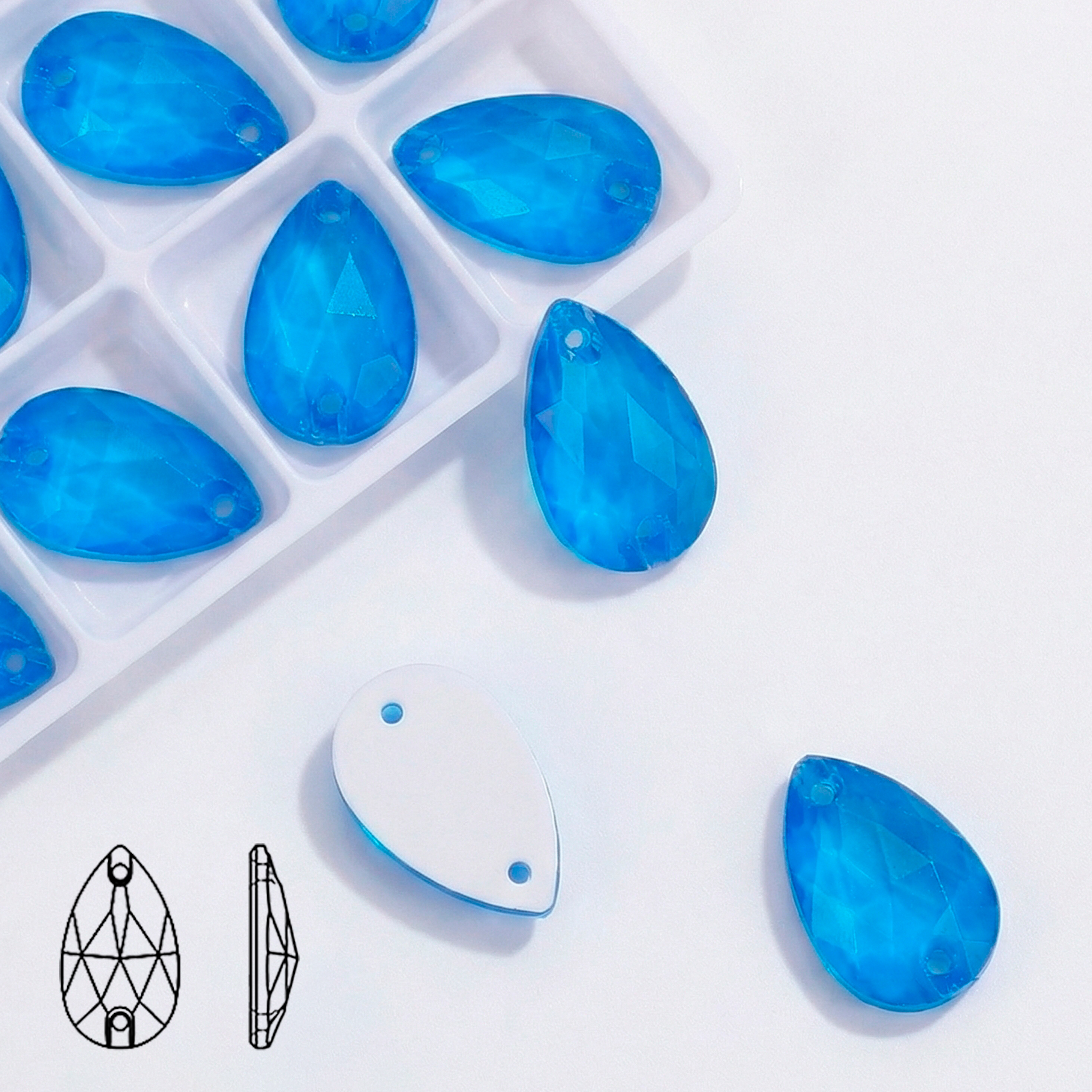 Пришивные стразы Neon Dark Blue (капля) — классическая каплевидная форма с двумя отверстиями для надёжного пришива. Глубокий неоново-синий оттенок (neon dark blue) — это насыщённый и яркий цвет, который выделяет изделие благодаря необычному «светящемуся» эффекту. Чистая и выразительная огранка позволяет кристаллу максимально ловить свет, создавая яркие синие отблески. Белая металлизированная подложка подчеркивает глубину оттенка и придаёт дополнительное сияние.