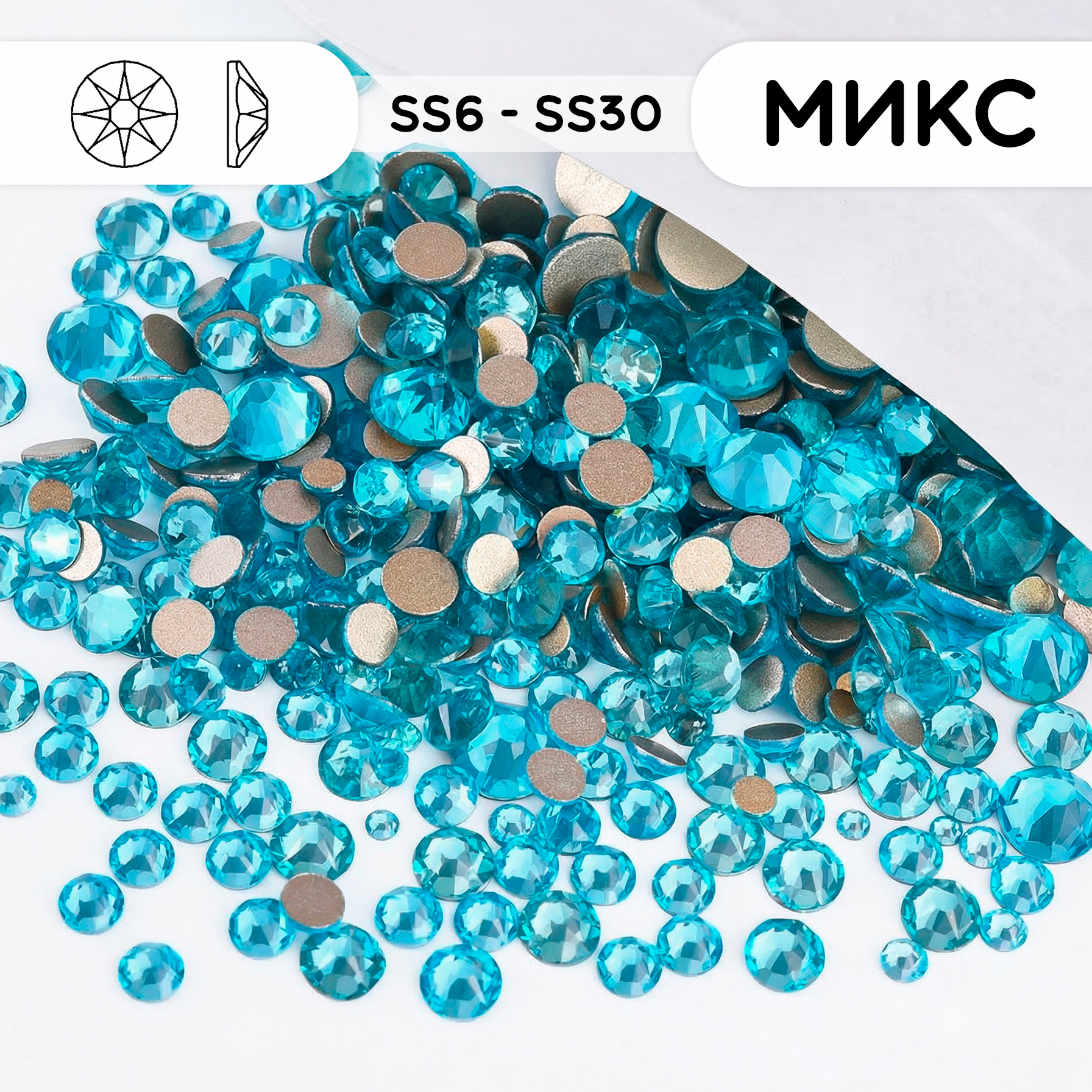 Стеклянные стразы холодной фиксации “Aquamarine” (аквамарин), микс размеров SS6–SS30