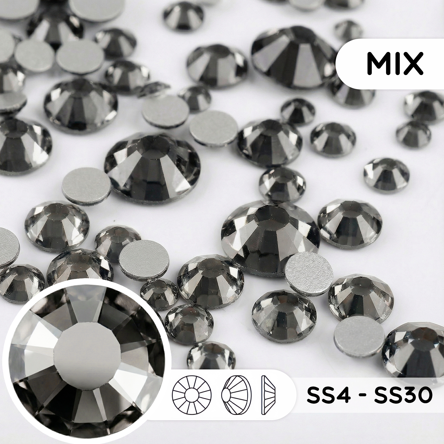 Стеклянные стразы холодной фиксации “Black Diamond” — микс размеров SS4–SS30
