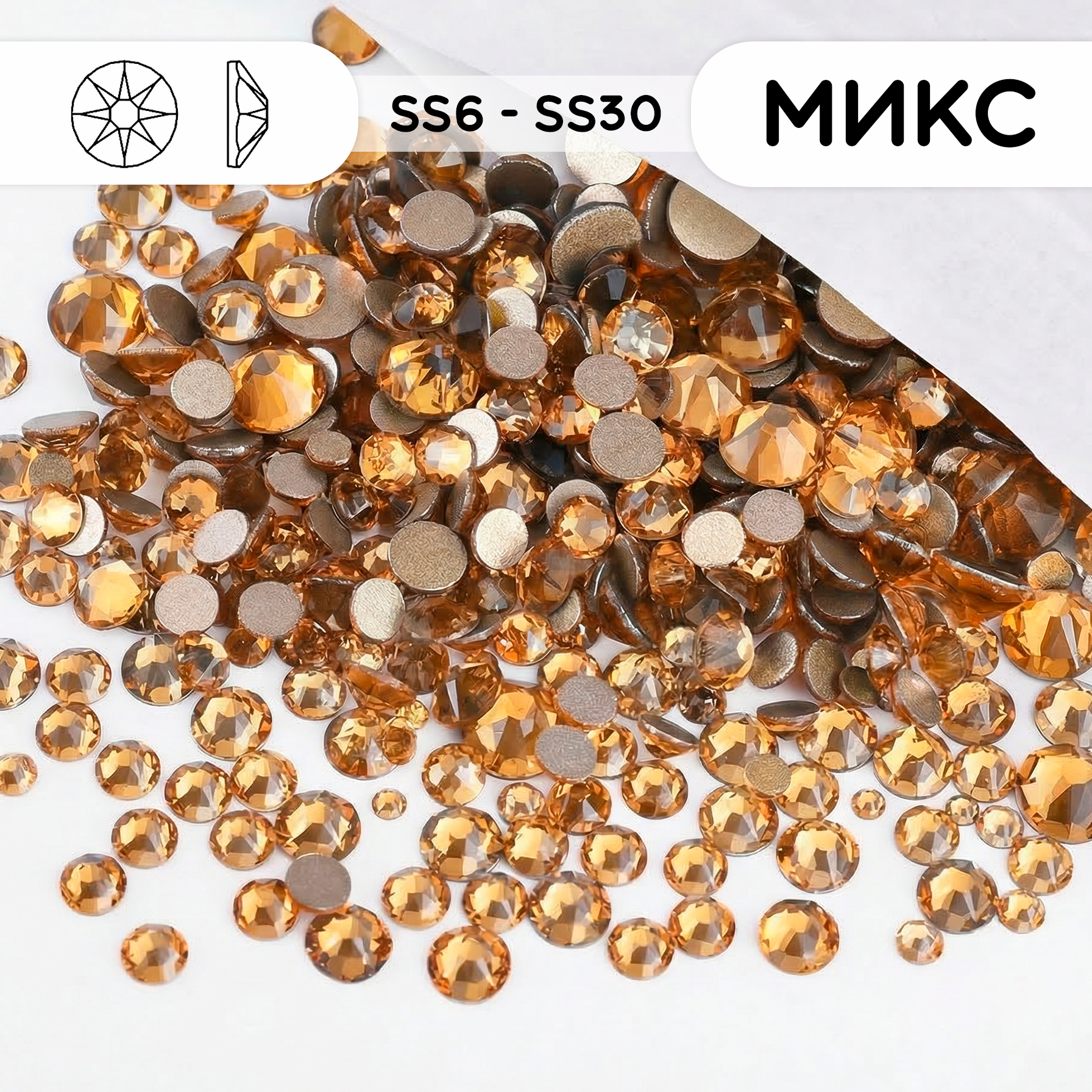 Стеклянные стразы холодной фиксации “Light Topaz” (светлый топаз), микс размеров SS6–SS30