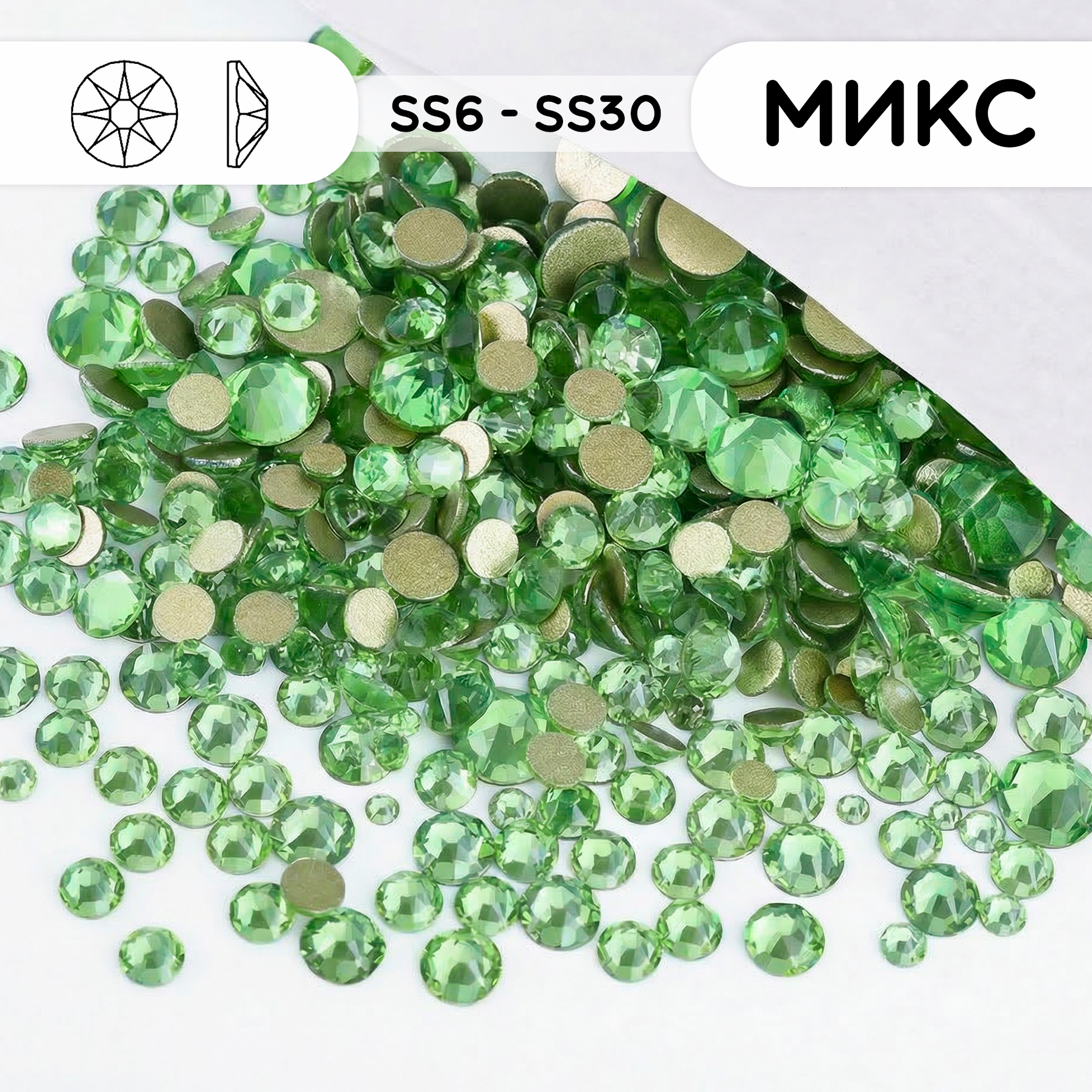 Стеклянные стразы холодной фиксации “Peridot” (светло-зелёные), микс размеров SS6–SS30