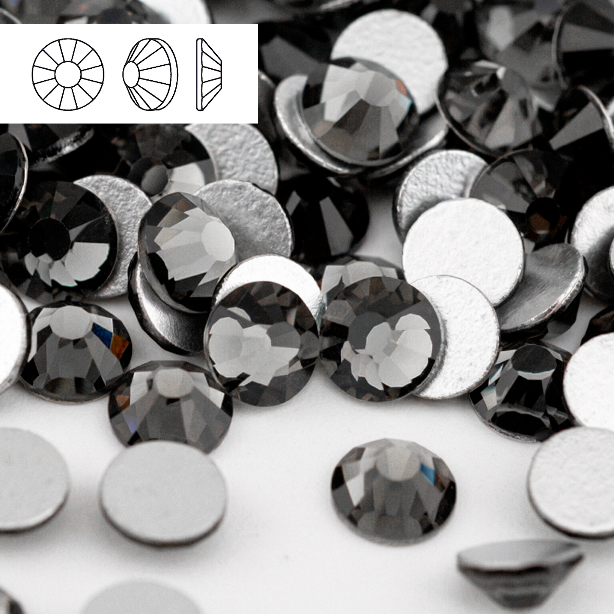 Стразы Black Diamond — круглые Round/Chaton с огранкой, без термоклея (non‑hotfix, холодная фиксация), с плоской обратной стороной для приклеивания. Цвет Black Diamond — дымчато‑графитовый (тёмно‑серый), без AB‑перелива; на свету дают холодные серебристые блики и эффектный «металлический» блеск.