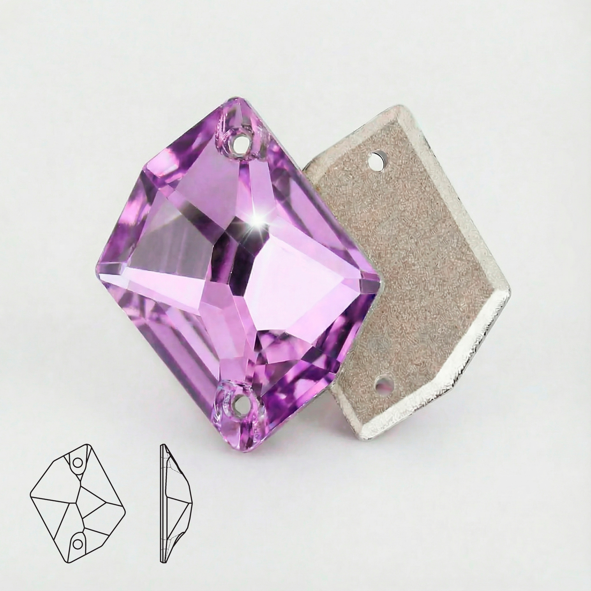 Пришивные стразы Cosmic Light Amethyst (Lavender) — фигурная форма Cosmic с двумя отверстиями для надёжного пришива. Оттенок светлый лавандово‑фиолетовый, полупрозрачный, без AB‑перелива: выглядит нежно и воздушно, но при этом хорошо «играет» на свету благодаря многогранной огранке. Металлизированная подложка усиливает блеск и добавляет визуальную глубину.