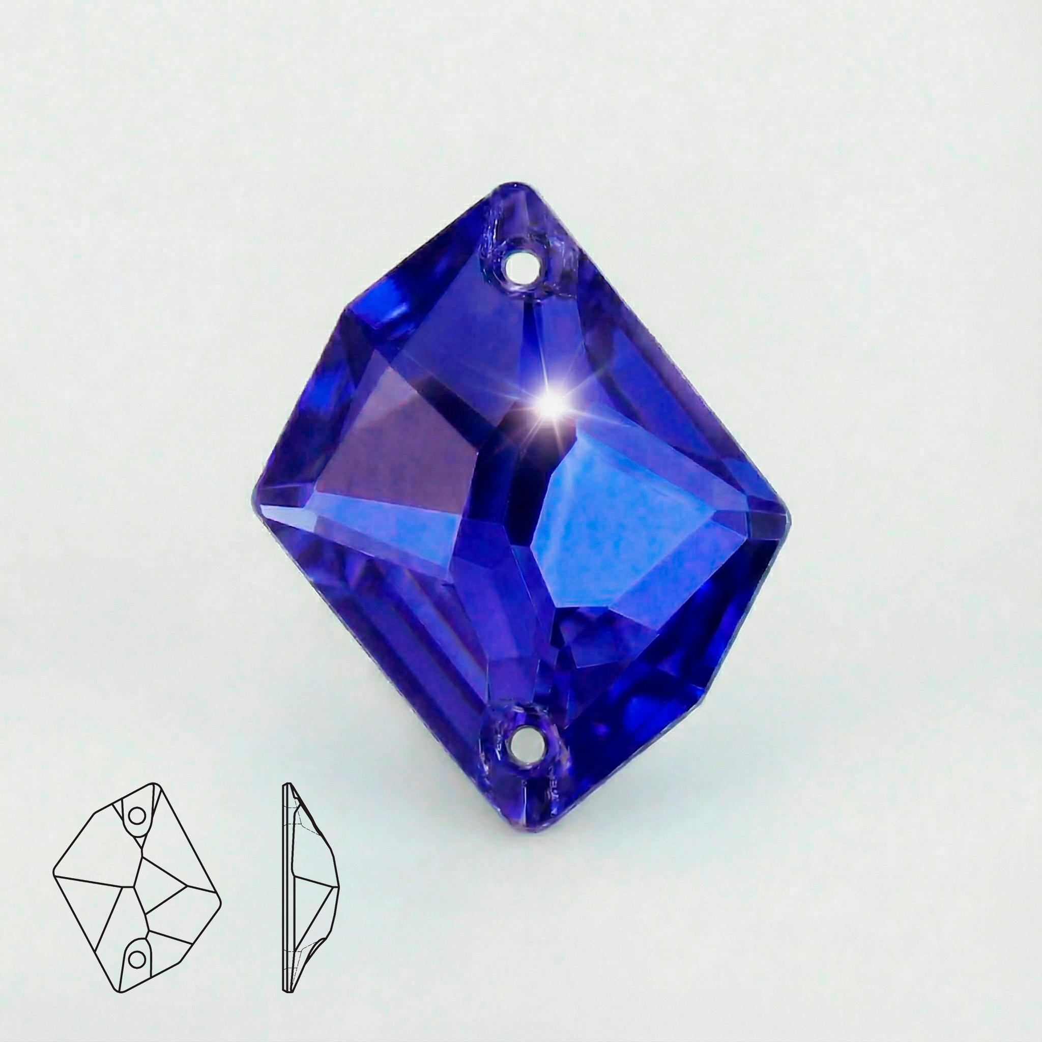Пришивные стразы Cosmic Sapphire (Royal Blue) — фигурная форма Cosmic с двумя отверстиями для надёжного пришива. Глубокий насыщенный синий оттенок без AB‑перелива даёт холодное яркое сияние и выразительный акцент; грани активно играют на свету. Металлизированная подложка усиливает блеск и визуальную глубину цвета.