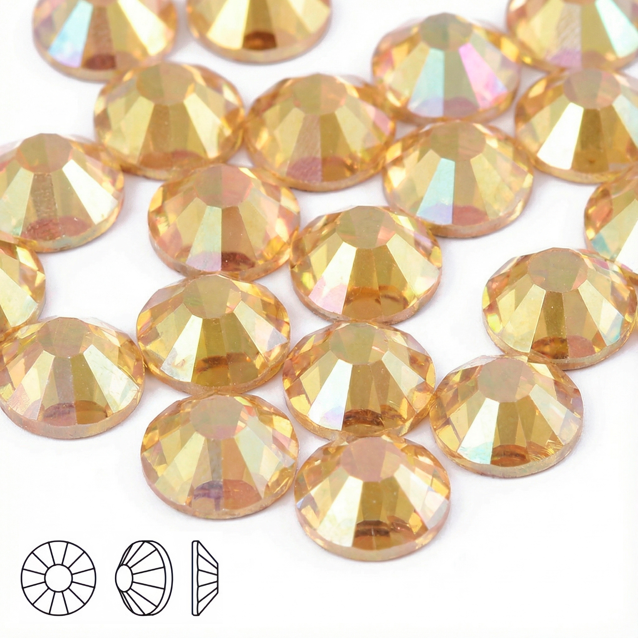 Плоские стразы Golden Light (холодная фиксация) для профессионального декора. Тёплый золотистый оттенок с мягким радужным переливом, точная огранка — стабильный блеск и аккуратная посадка в выкладке.