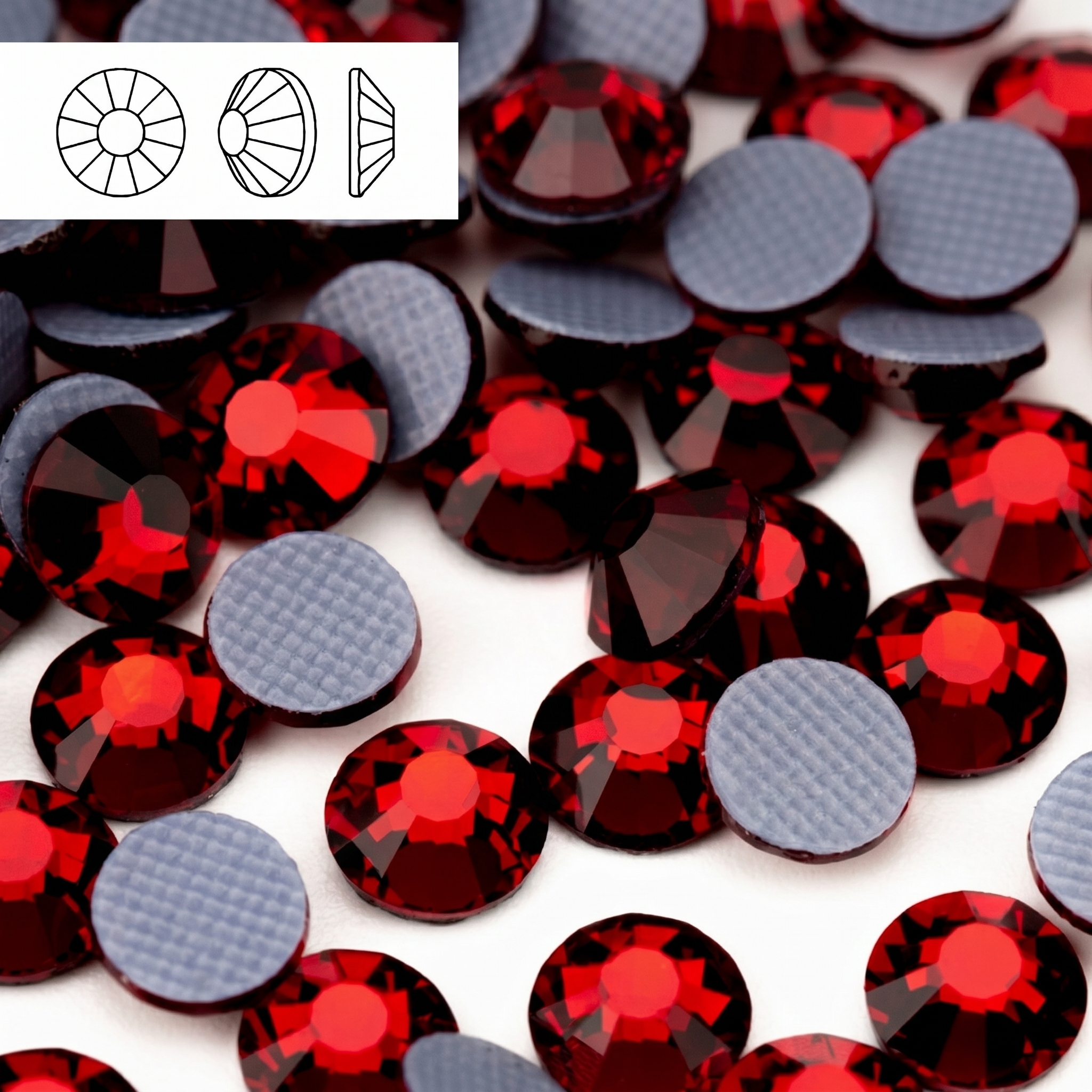 Термостразы Hotfix Garnet (примерно; по фото ближе всего к оттенку Garnet / Dark Siam) — круглые стразы Round/Chaton с огранкой, на обратной стороне нанесён термоклей для фиксации нагревом. Цвет — глубокий бордово‑красный (винный), без AB‑перелива; на свету даёт насыщенные красные блики и смотрится очень «драгоценно».