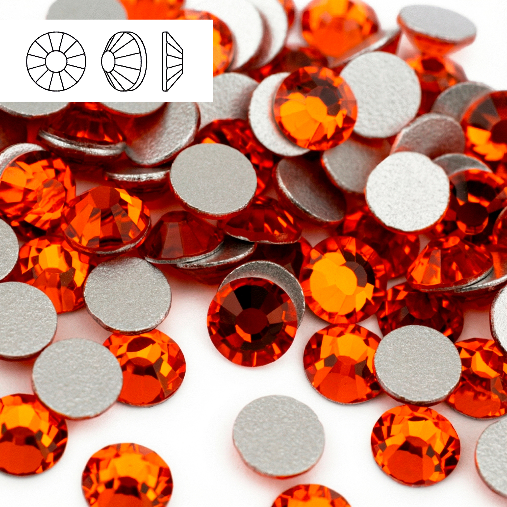 Стразы Hyacinth — круглые Round/Chaton с огранкой, без термоклея (не hotfix), с плоской обратной стороной для приклеивания. Цвет Hyacinth — насыщенный огненно‑оранжевый / красно‑оранжевый, без AB‑перелива; на свету дают яркие янтарно‑мандариновые блики и очень сильное искрение