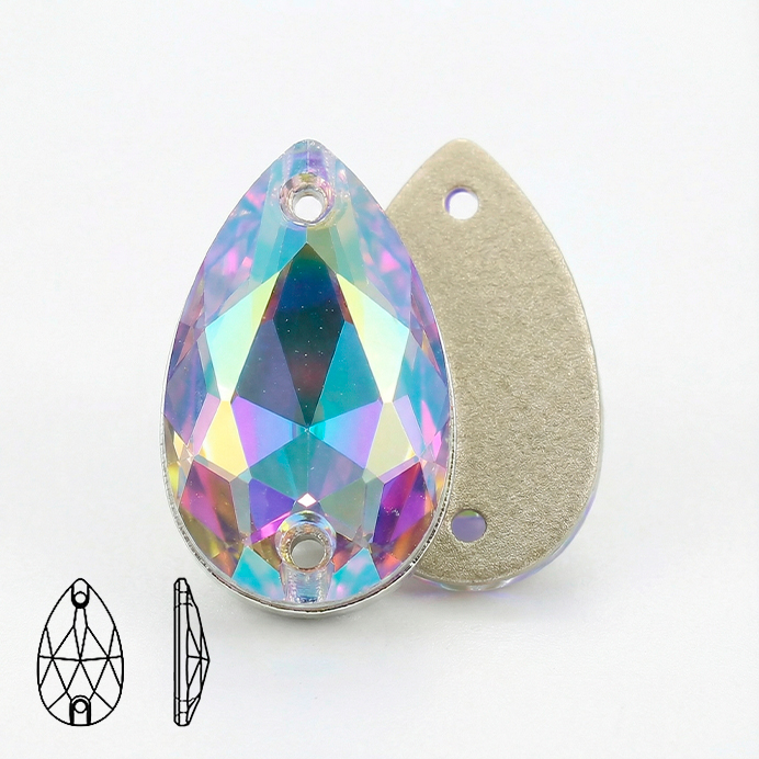 Пришивные стразы капля (Pear/Teardrop) Crystal AB — вытянутая форма «капля» с двумя отверстиями для надёжного пришива. Оттенок Crystal AB — прозрачный кристалл с покрытием Aurora Borealis: даёт яркий радужный перелив розово‑фиолетовых, голубых, зелёных и жёлто‑золотых оттенков в зависимости от света и угла. Гранёная огранка усиливает «искры» и контраст бликов, а металлизированная подложка делает переливы более насыщенными и заметными.