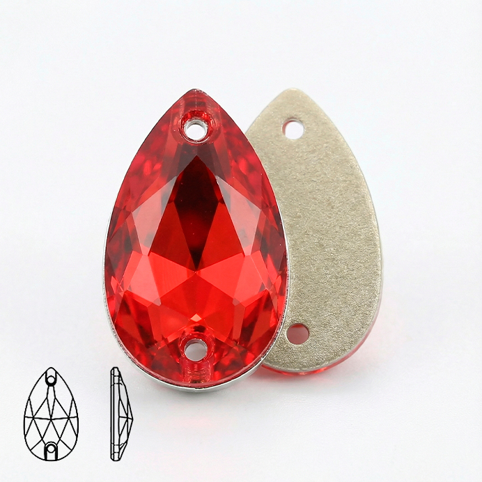 Пришивные стразы капля (Pear/Teardrop) Light Siam — вытянутая форма «капля» с двумя отверстиями для надёжного пришива. Оттенок Light Siam — яркий рубиново‑красный с тёплым подтоном, чистый и насыщенный, без AB‑перелива. Гранёная огранка даёт сочные красные вспышки и активную игру света, а металлизированная подложка усиливает сияние и делает цвет визуально глубже.