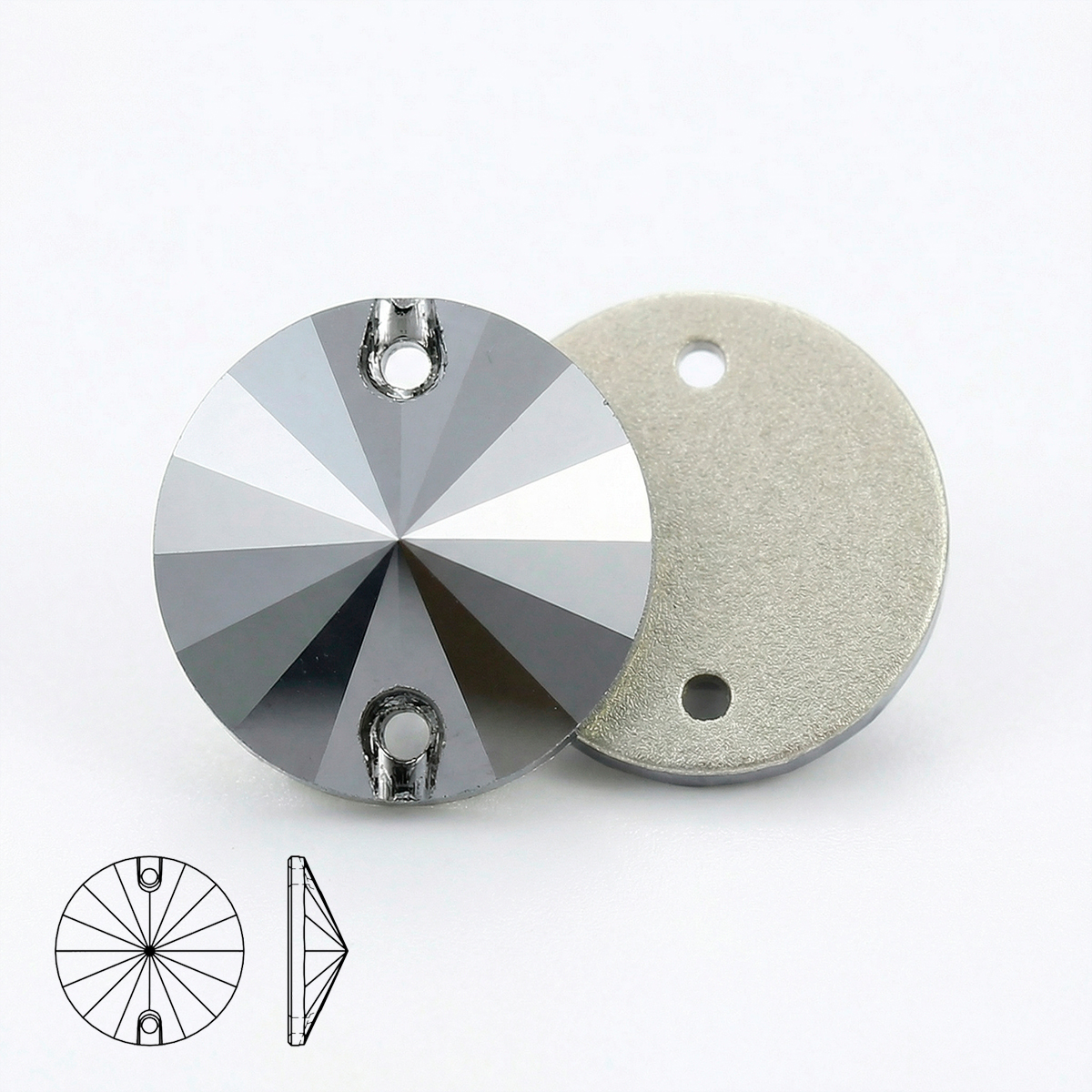 Пришивные стразы Rivoli Jet Hematite — круглая гранёная форма Rivoli с двумя отверстиями для надёжного пришива. Оттенок Jet Hematite — глубокий графитово‑чёрный с холодным металлическим (гематитовым) блеском, строгий и эффектный, без AB‑перелива. Многогранная огранка даёт контрастные серебристо‑стальные блики и активную игру света, а металлизированная подложка усиливает сияние и делает цвет визуально более плотным и «стальным».