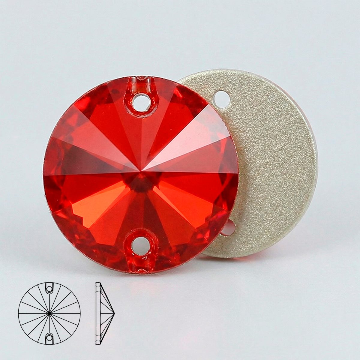 Пришивные стразы Rivoli Light Siam — круглая гранёная форма Rivoli с двумя отверстиями для надёжного пришива. Оттенок Light Siam — яркий рубиново‑красный с тёплым подтоном, чистый и насыщенный, без AB‑перелива. Многогранная огранка даёт сочные красные вспышки и активную игру света, а металлизированная подложка усиливает сияние и делает цвет визуально глубже.