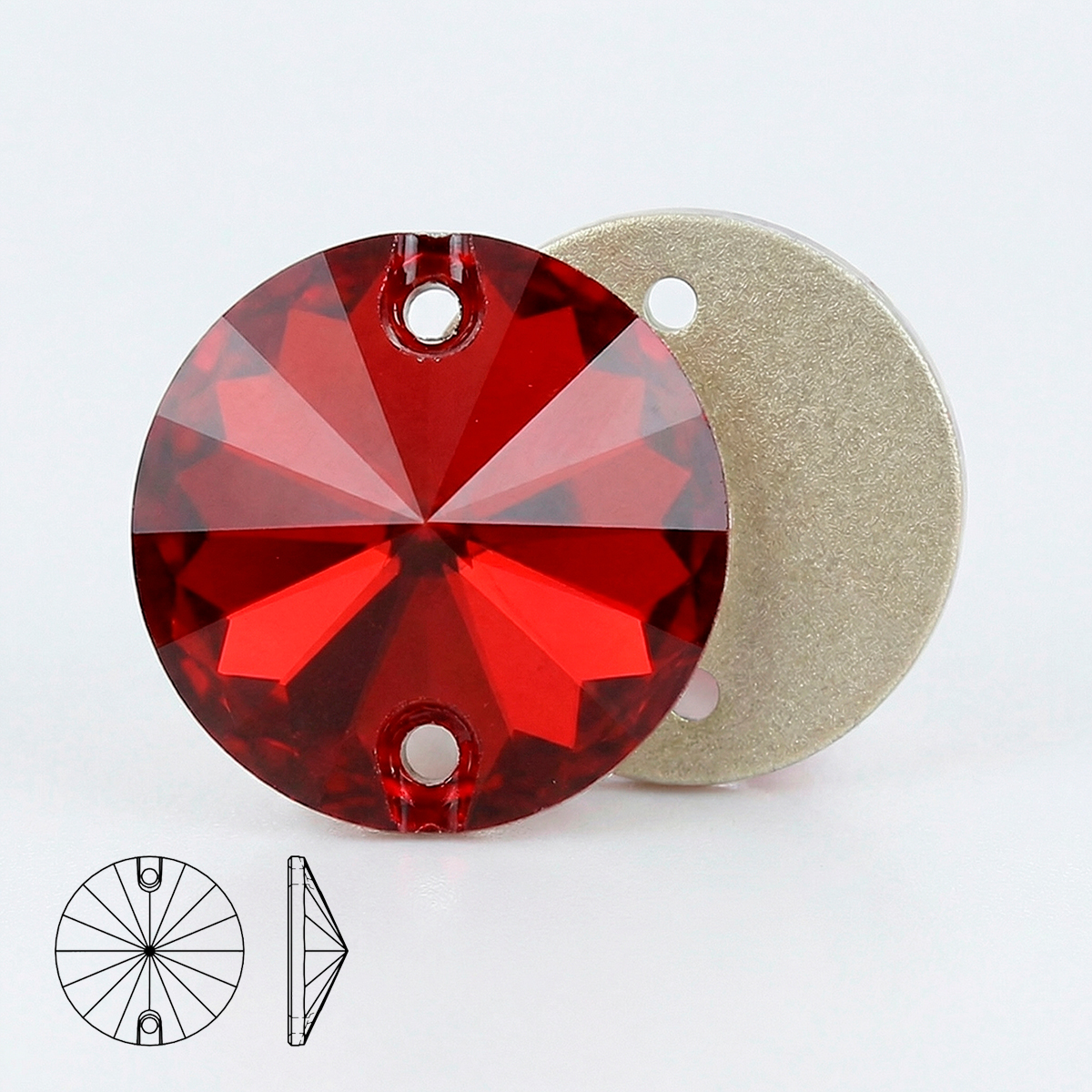 Пришивные стразы Rivoli Siam — круглая гранёная форма Rivoli с двумя отверстиями для надёжного пришива. Оттенок Siam — глубокий классический красный с холодным рубиновым подтоном, насыщенный и контрастный, без AB‑перелива. Многогранная огранка даёт яркие красные вспышки и активную игру света, а металлизированная подложка усиливает сияние и делает цвет визуально ещё глубже.