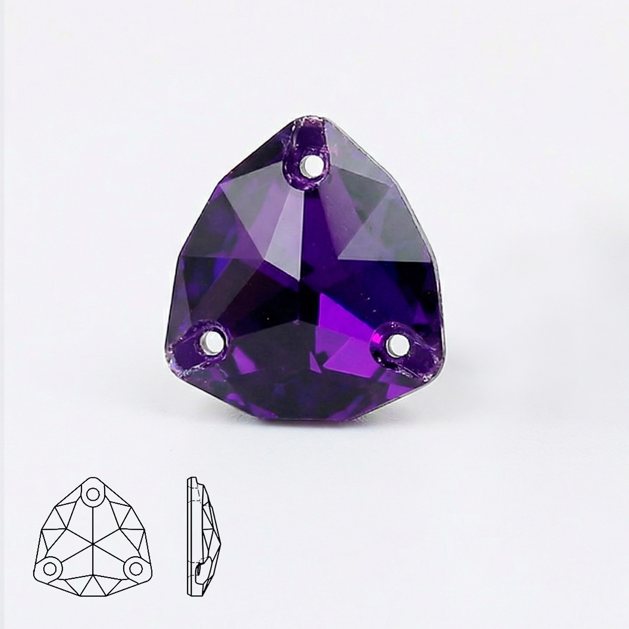 Пришивные стразы Trilliant Purple Velvet — треугольная гранёная форма Trilliant с тремя отверстиями для надёжного пришива. Оттенок Purple Velvet — глубокий бархатный фиолетовый с затемнением (более «плотный» и драматичный, чем Amethyst), без AB‑перелива. Огранка даёт выразительные блики и красивую игру света, а металлизированная подложка усиливает сияние и добавляет глубину цвету.