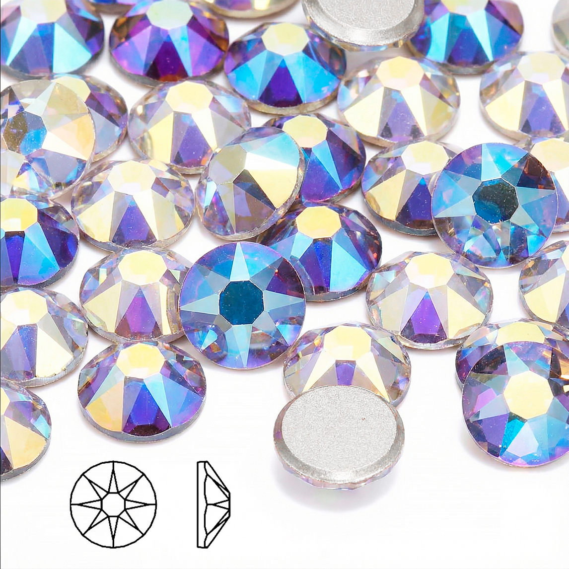 Стразы холодной фиксации Starry Sky с огранкой XIRIUS — круглые flatback (без термоклея), с фольгированной подложкой. Цвет Starry Sky — эффектное многоцветное покрытие с «космическим» переливом: в бликах читаются сине‑бирюзовые, фиолетовые и золотистые оттенки, за счёт чего стразы выглядят очень ярко и необычно. Огранка XIRIUS (много граней) усиливает искрение и делает свечение максимально заметным при движении и на сценическом свете.