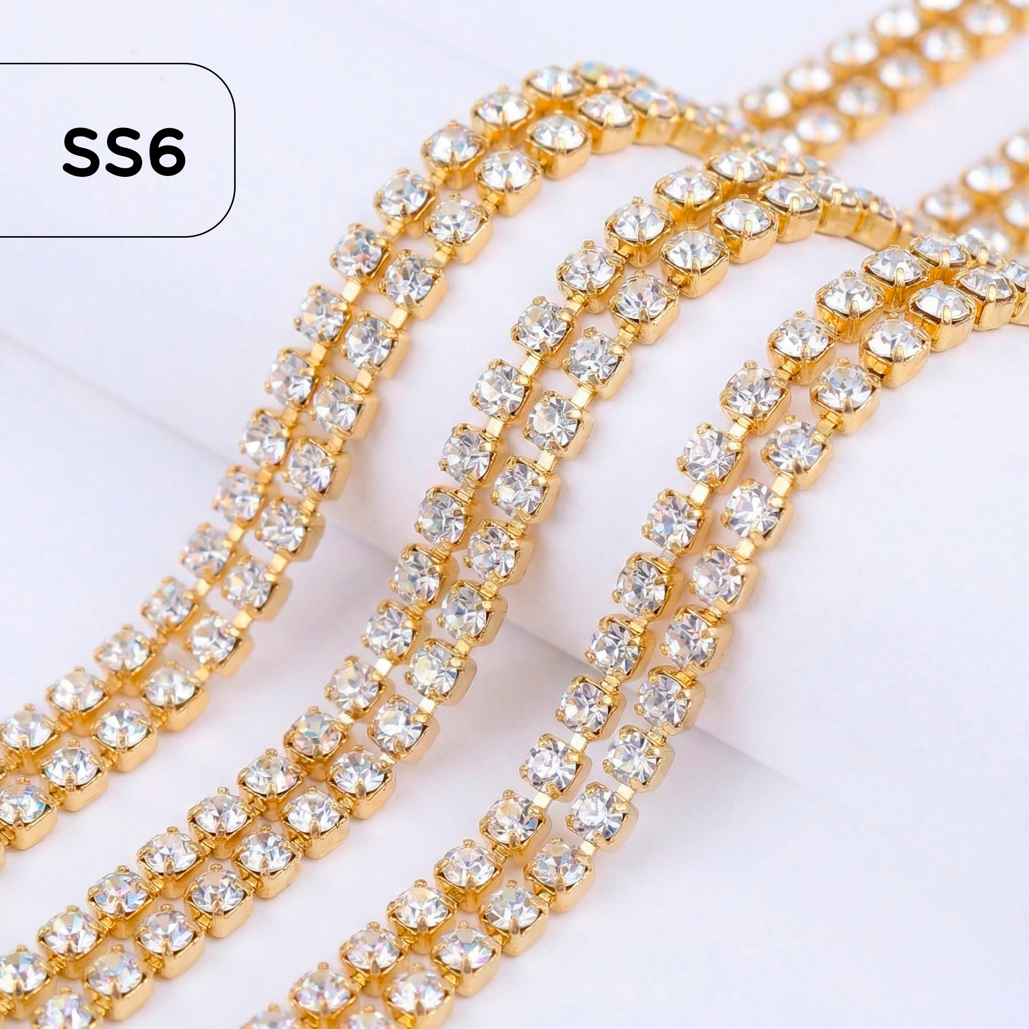 Стразы ровно закреплены в один ряд, обеспечивая непрерывное сияние и изысканный блеск при любом освещении. Металлическая основа надёжно держит кристаллы, а гибкость цепочки позволяет с лёгкостью использовать её на изгибах, по линиям срезов, швам или для создания сложных узоров.